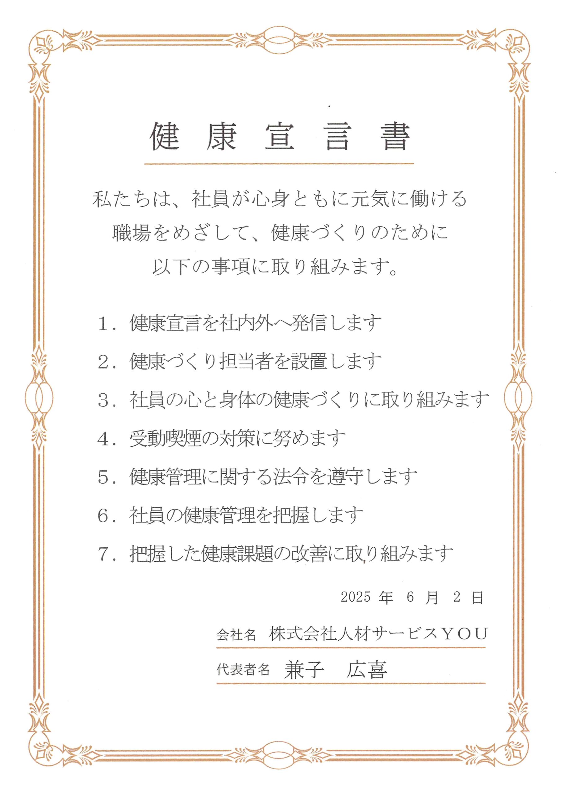 株式会社人材サービスYOUは、全スタッフが心身ともに健康でいきいきと働けることが事業の持続的な発展には不可欠だと考えています。